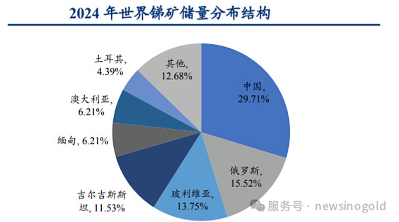 全球銻資源主要分布于環(huán)太平洋成礦帶、中亞成礦帶和地中海成礦帶,具有分帶性與集中性特點。按銻礦儲量排名依次為中國、俄羅斯、玻利維亞、吉爾吉斯斯坦、澳大利亞、土耳其、加拿大、美國、塔吉克斯坦、巴基斯坦、墨西哥,分別占比25.64%、18.70%、16.56%、13.89%、7.48%、5.34%、4.17%、3.21%、2.67%、1.39%、0.96%。