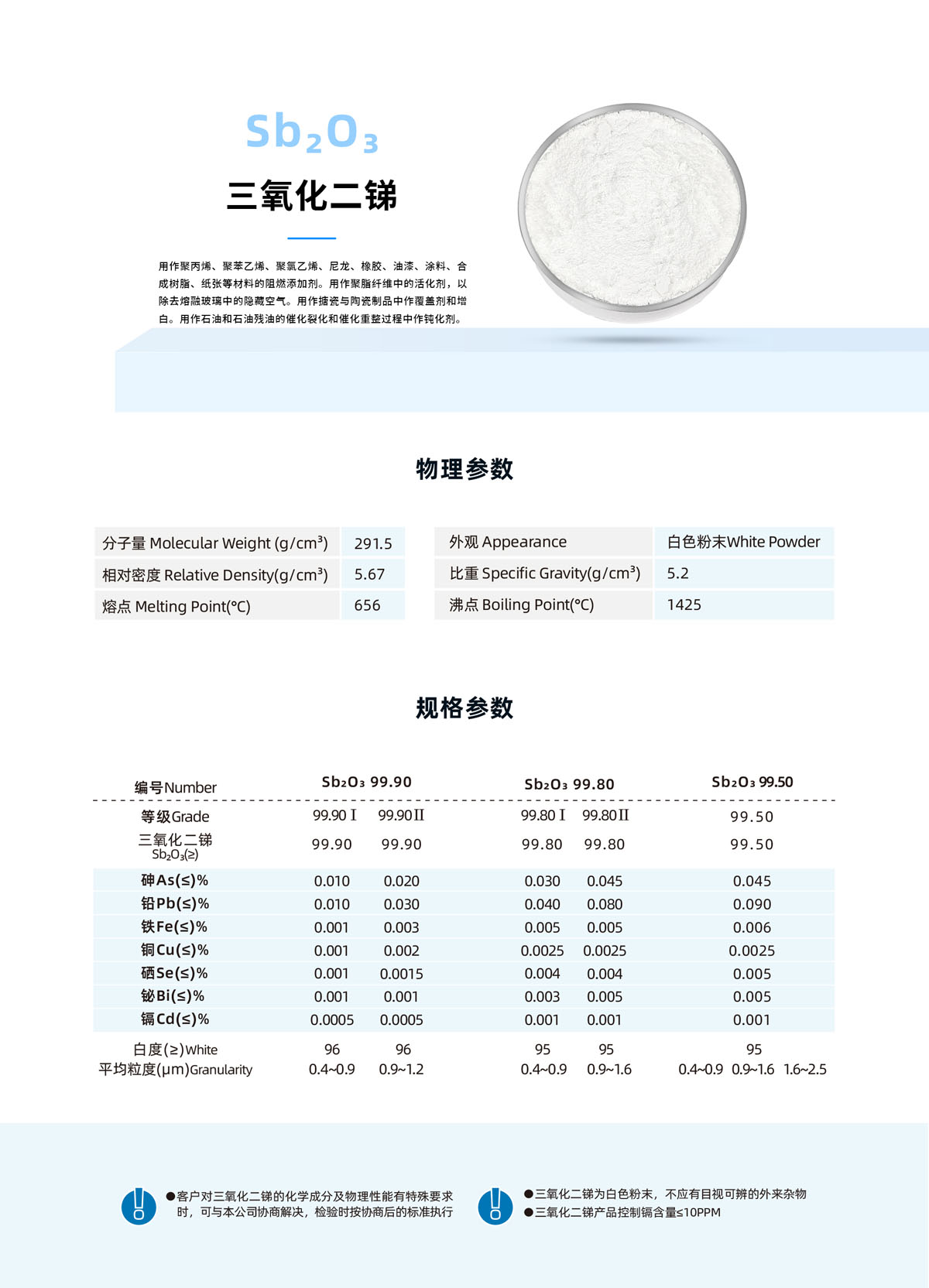 用作塑料、橡膠、油漆、涂料、合成樹脂、紡織、化纖等材料的阻燃添加劑。用于光伏玻璃的澄清劑,以除去熔融玻璃中的隱藏空氣。用作聚酯PET合成縮聚反應的催化劑;用作石油催化裂化和催化重整過程中的鈍化劑。用作搪瓷與陶瓷制品中作覆蓋劑和增白。