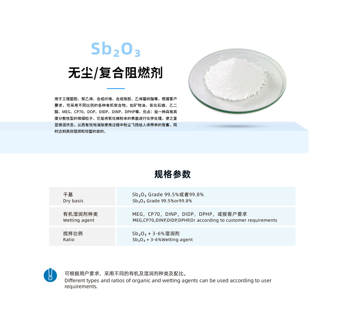 廣泛用于PVC、PP、PE、ABS、PBT、PS、PA、AS等塑料的溴系阻燃協效劑,其與鹵素化合物(如溴、氯)等配合使用可提高阻燃效果,對基材的力學性能影響小,添加少量即可達到UL94 V-0級阻燃標準。